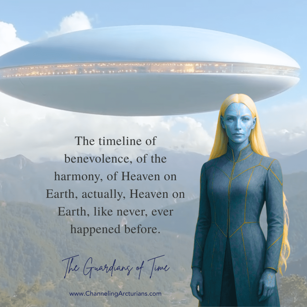 The highest timeline is simply a frequency, the highest possible frequency for you, Guardians of Time are Pleiades from the future, we call themselves Guardians, because we see the past, the future, and the now. We see the probable parallel Earth for human family, and through this channel, we might be speaking about the most probable timeline of New Earth embraced within. You see, we are Collective, Guardians of Time, Guardians of Seven Hybrid Races, coming together today to join our beloved human family in finding they new way of connection through their heart with E.T’s Hybrid Races. Many of you are afraid of Alliance frequencies; and some of you are actually our representants not awaken yet. Our human family are our Ancestors, are our future. The timeline which we are referring to is the timeline of benevolent, of the harmony, of Heaven on Earth, actually. Heaven on Earth, like never, ever happen before.